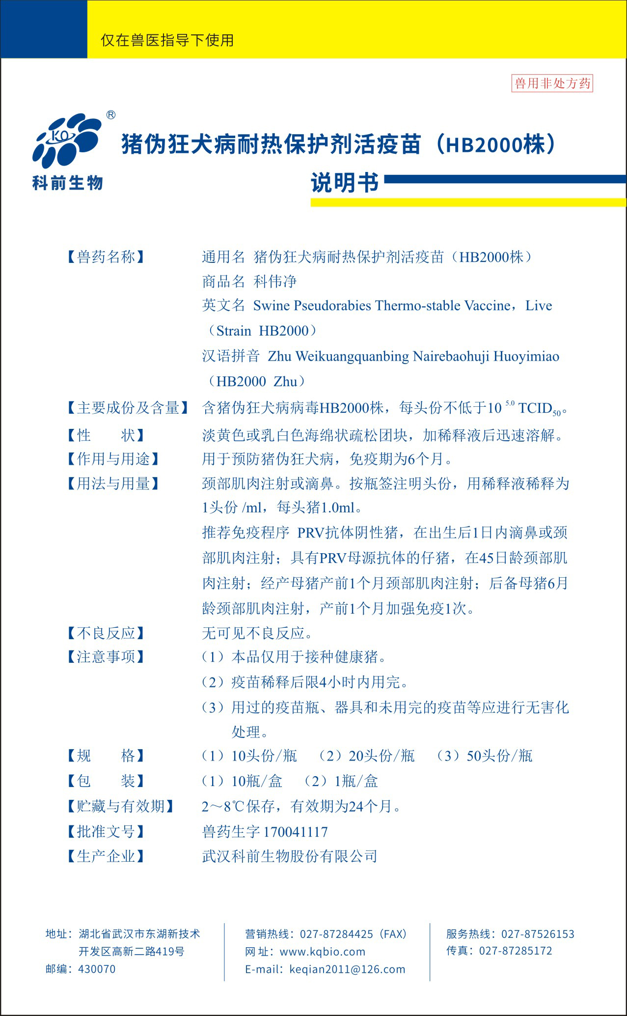 猪伪狂犬病耐热保护剂活疫苗(HB2000株)